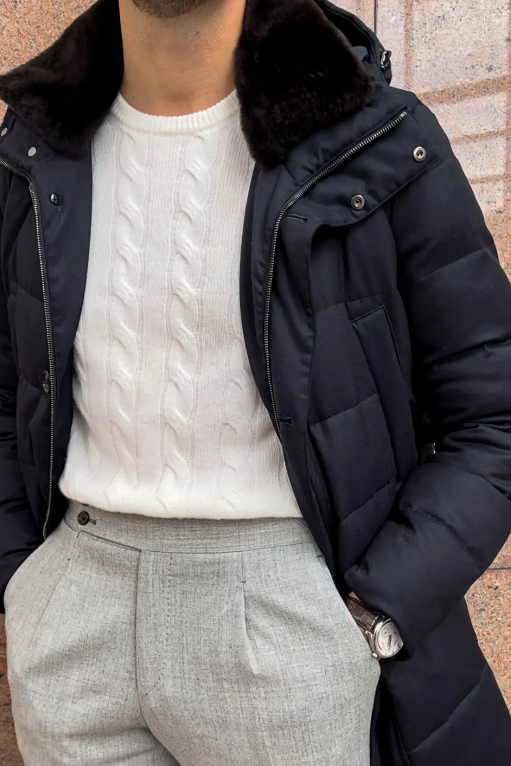 Our Blue Down Coat Will Be Your Best Ally To Remain Elegant When The Temperatures Start Going Down. It Is Crafted From Water Resistant Wool And Features A Removable Shearling Collar, An Adjustable Hood, Four Front Pockets As Well As Two Inside Zip Pockets. A Button And Zip Closure Finishes The Piece.