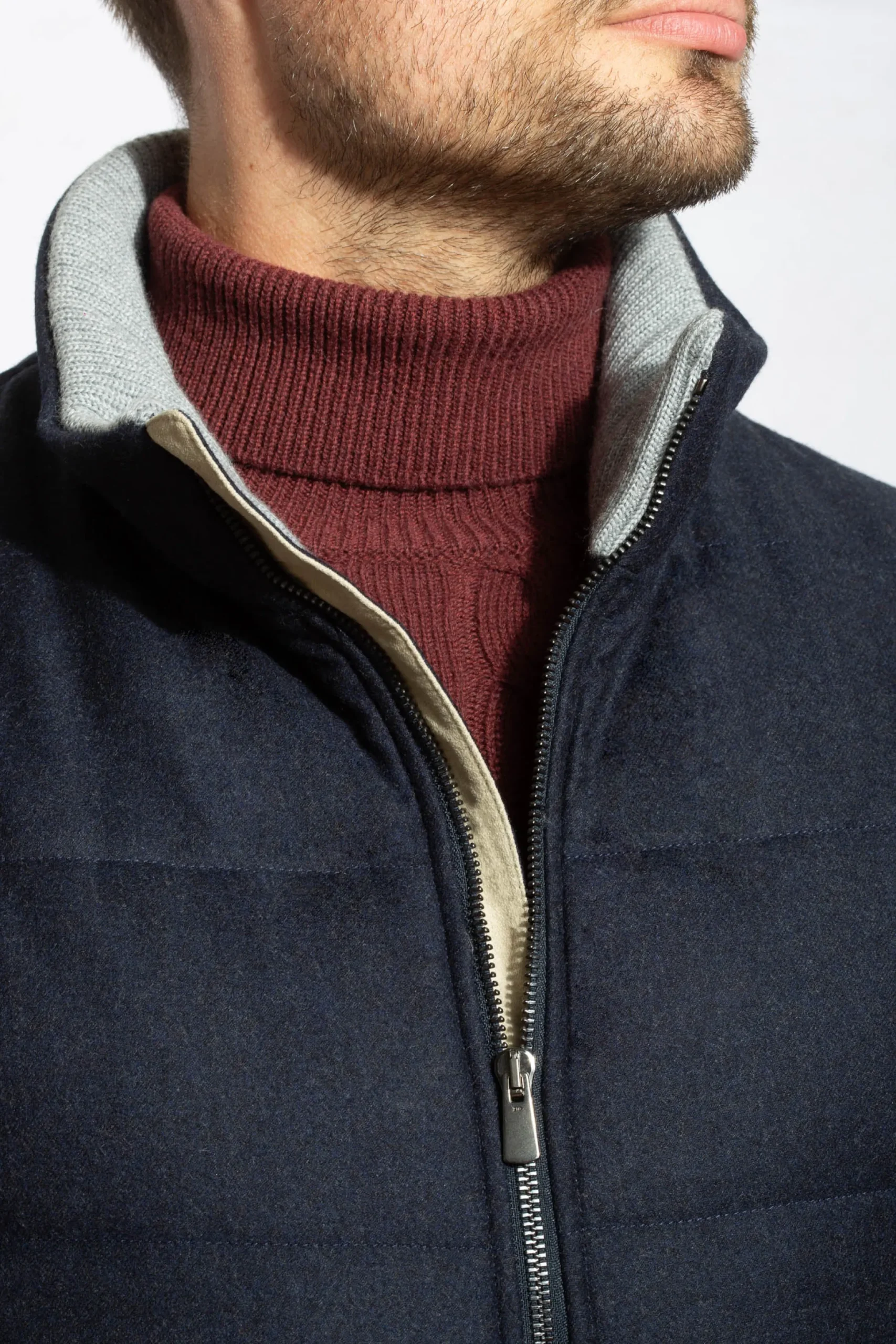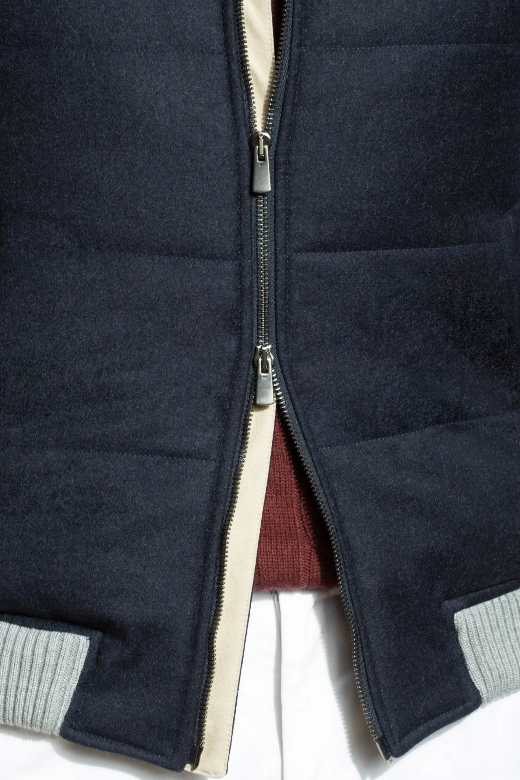 Our Blue Down Vest Will Be Your Best Ally To Remain Elegant With Cooler Temperatures And Can Easily Be Worn Over A Knit. It Is Crafted From A Blend Of 95% Wool And 5% Cashmere Woven By Loro Piana (Favola Collection) And Coated With Their Rain System® Technology, Protecting This Garment From Dust, Dirt And Water-Based Stains.
