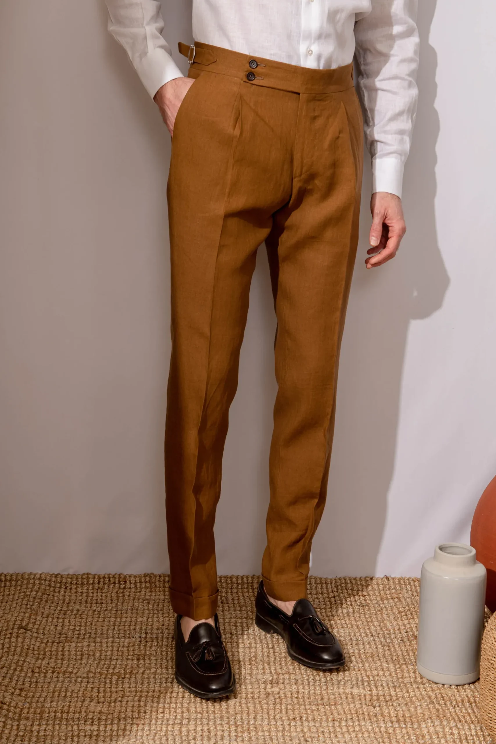 We Created A Tailored Trousers With Single Pleats, A High-Rise With A Slim Fit Cut, A Large Extended Tab Fastening Belt And The Side Adjusters. The Semi Slim Cut Enhances The Silhouette And, The Bottom Of 18 Cm Can Wear These Trousers With All Types Of Shoes, Allowing It To Remain Elegant And Classic At The Same Time. The Trousers Are Designed With Unfinished Hems That Allow You To Customise The Length.
